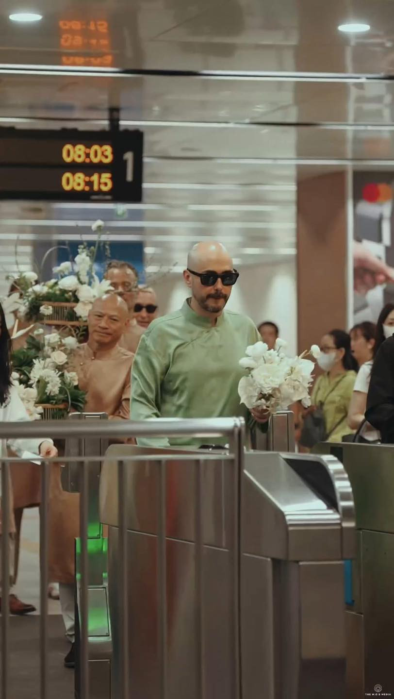 Không cầu kỳ xe sang, chú rể người nước ngoài tươi cười cầm trên tay bó hoa cùng dàn bê tráp cưới trong trang phục áo dài truyền thống của dân tộc háo hức đợi tàu metro cập bến rồi lại tiếp tục ngồi trên xe buýt 2 tầng di chuyển đến đón dâu đầy náo nhiệt đã khiến dân tình không khỏi thốt lên: “Sao mà dễ thương!”
