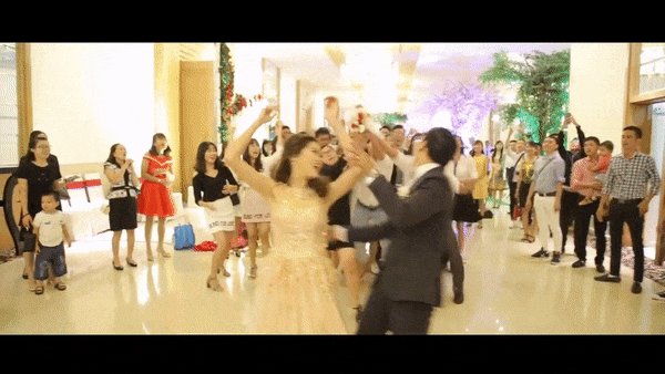 Cô dâu - chú rể vừa hát vừa tiến tới khán đài ra mắt khách mời.