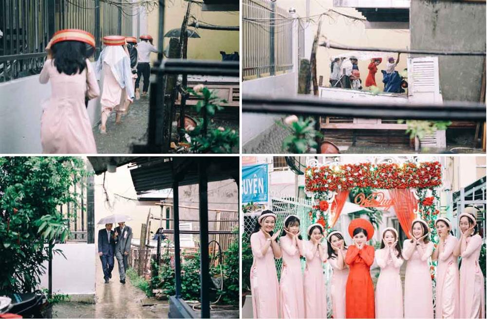 Minh Thư kể tiếp: "Cô dâu chú rể tháo giày bỏ vào túi nilong xách đi. Ba vợ buộc bọc vào chân còn mang nguyên giày. Các cụ hai bên cũng nhón gót đi, đội bê tráp đỡ lễ tháo luôn cả giày đi chân đất... Vợ chồng nhà hàng xóm đối diện có con nhỏ mà để con bé đó chạy ra che dù hộ tống đoàn rước dâu. Dàn bưng mâm thì có người đội mâm chạy ra, có vài người kèm cô dâu thì cầm áo mưa làm đoàn tàu đi ra. Nói chung đó là một trải nghiệm khá đặc biệt của đám cưới miền Tây, hôn lễ trong cơn mưa khá bất ngờ".
