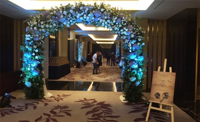 Trước giờ hôn lễ bắt đầu (18h), công tác chuẩn bị vẫn đang diễn ra. Cùng với đó, đội ngũ an ninh cũng được thắt chặt từ cửa thang máy cho tới bên ngoài phòng tiệc. Đám cưới giới hạn chỉ có những khách mời là bạn bè và người thân của cô dâu chú rể.