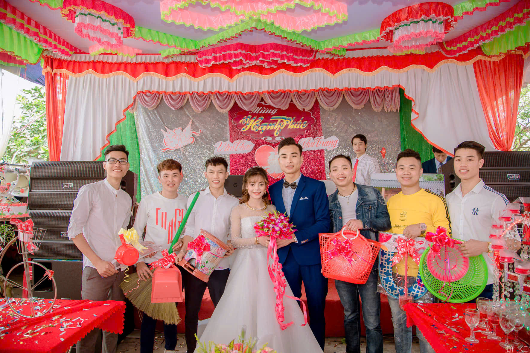 Trong ngày vui ấy, “hội bạn làng” của chú rể đã hóa trang thành siêu nhân với trang phục rực rỡ sắc màu đỏ, vàng, xanh... để khuấy động không khí và tặng quà chúc mừng.