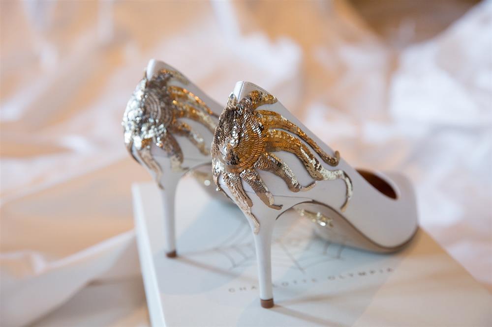 Giày cưới của cô dâu được làm bởi nhà thiết kế giày lừng danh người Anh Charlotte Dellal. Họa tiết trên giày trùng với họa tiết váy. Đến cả gối nhẫn của cặp đôi cũng in hình họa tiết mặt trời.