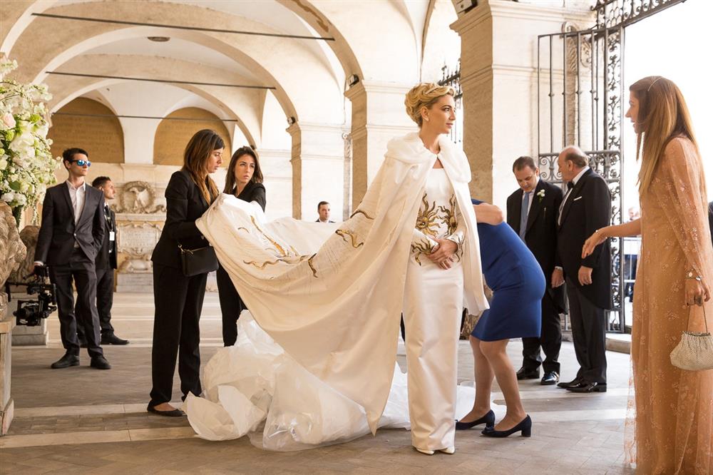 Về váy cưới cho buổi lễ chính, cô dâu lựa chọn chiếc Haute Couture của thương hiệu Schiaparelli thiết kế riêng cho mình. Đây là một mẫu váy cưới dáng cột cùng áo choàng dài quét đất. Họa tiết trên váy và áo choàng là hình ảnh mặt trời rực rỡ.