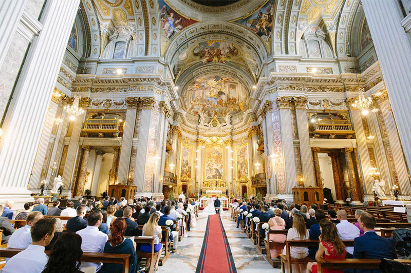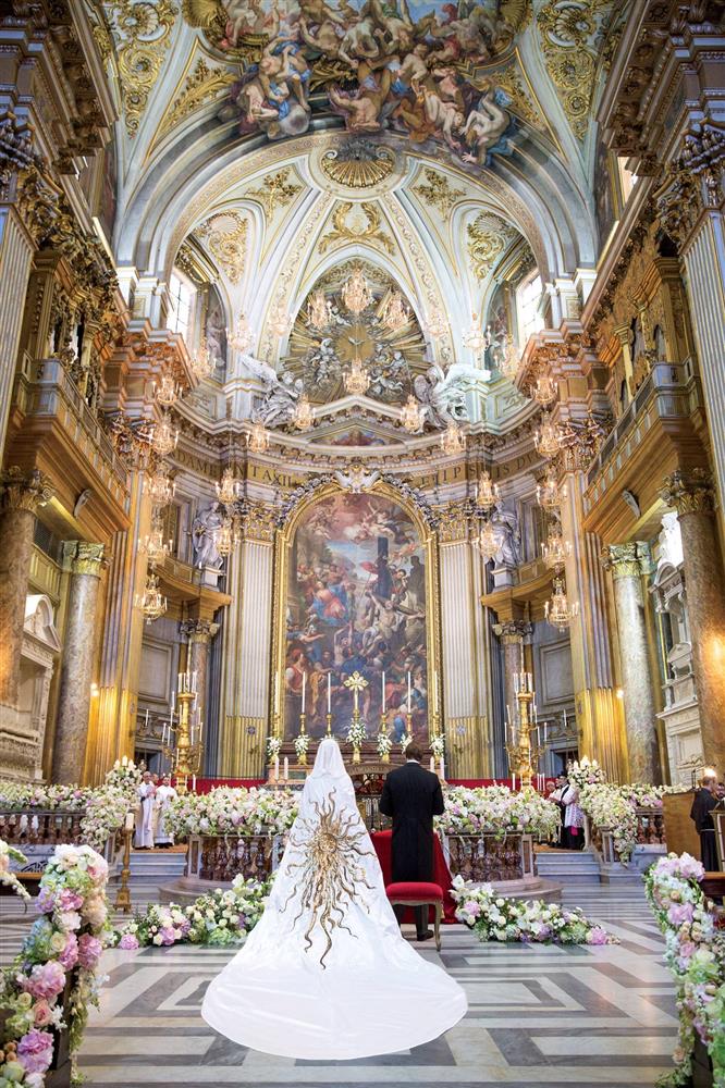 Hình ảnh cô dâu chú rể được làm phép cưới dưới nhà thờ có trần là một bức bích họa lớn khiến tất cả ai chứng kiến cũng phải trầm trồ. Sảnh nhà thờ được trang trí hoa tươi rực rỡ. Sau khi tiến hành làm phép xong xuôi, cặp đôi tiến ra ngoài và trao cho nhau một nụ hôn dưới sự chứng kiến của mọi người.