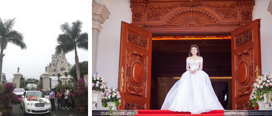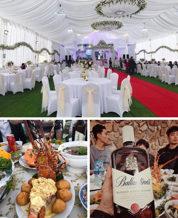 Đám cưới còn có sự xuất hiện của cặp đôi xe ô tô siêu sang Rolls-Royce Phantom và Benley. Ngoài ra, cỗ cưới có nhiều món ăn, đồ uống đắt tiền như rượu ngoại, tôm hùm,…