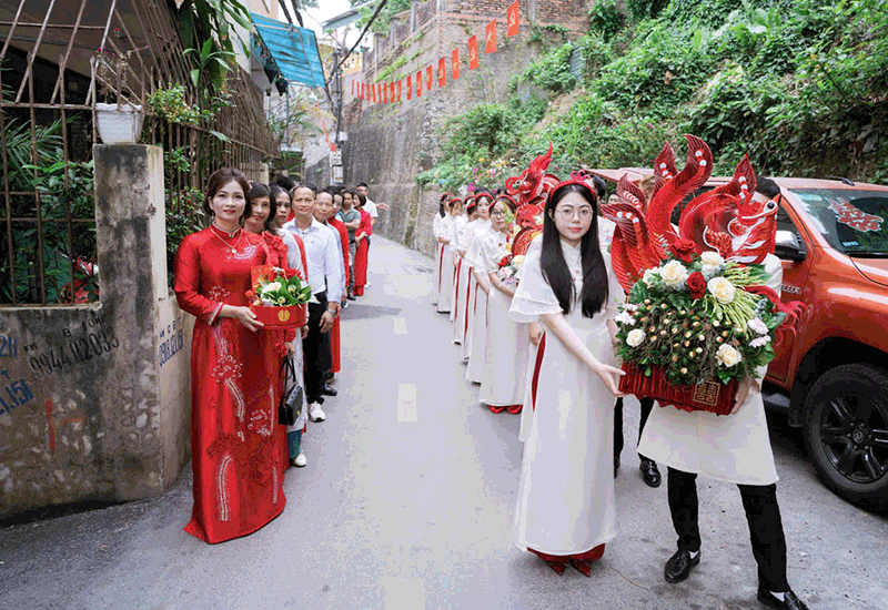Sáng 28/3, bố mẹ chú rể cùng khoảng 50 người thuộc đoàn nhà trai mang theo 9 tráp lễ đến nhà gái xin dâu. Bố mẹ cô dâu đứng ra nhận lễ, tác thành cho đôi trẻ.