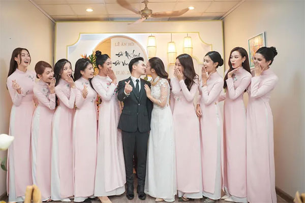 Lễ ăn hỏi của hoa hậu Đỗ Mỹ Linh và thiếu gia Đỗ Vinh Quang diễn ra tại nhà riêng ở Hà Nội. Bên cạnh cặp đôi nhân vật chính thì Đỗ Quang Vinh - con trai cả bầu Hiển cũng chiếm sóng nhờ nhan sắc của mình.