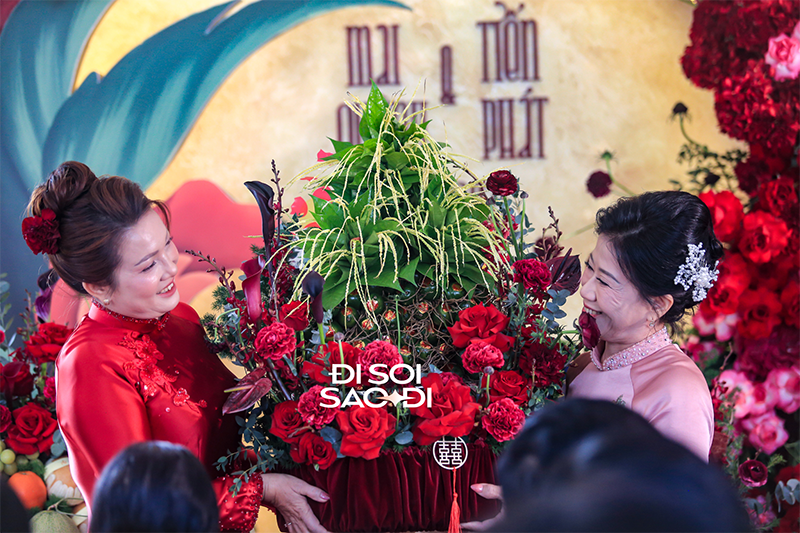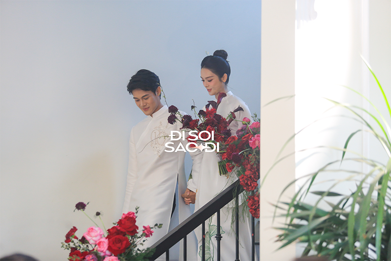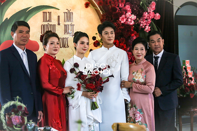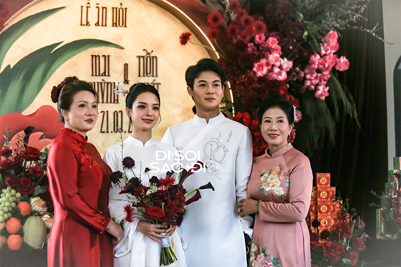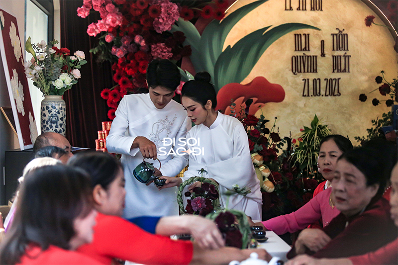 Ngày trọng đại của cặp đôi có sự hiện diện của 2 bên gia đình. Trước sự chứng kiến của những bố mẹ và dòng họ, Quỳnh Lương và Tiến Phát lần lượt thực hiện những nghi lễ truyền thống trong đám hỏi. Những khoảnh khắc chung khung hình của đôi tân lang tân nương không chỉ gấp đôi nhan sắc mà còn ngập tràn sự hạnh phúc.