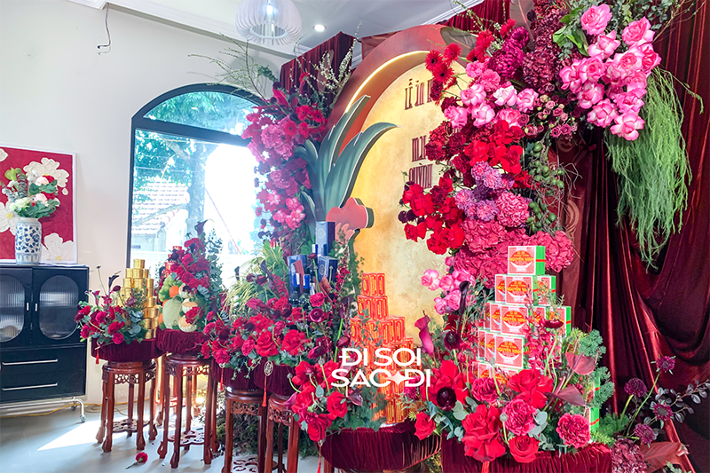 Sáng 21/3, lễ ăn hỏi của diễn viên Quỳnh Lương và bạn trai Tiến Phát diễn ra tại Phú Thọ - quê nhà của cô dâu. Ngay từ sớm, gia đình đàng gái đã rộn ràng chuẩn bị trang hoàng không gian để đón tiếp khách mời. Theo quan sát, bên trong nhà của Quỳnh Lương được dựng rạp, bàn ghế vô cùng chỉn chu. Bên trong khu làm lễ truyền thống ngập tràn hoa tươi, lấy màu đỏ làm chủ đạo, tạo nên không gian ấm áp nhưng không kém phần sang trọng.