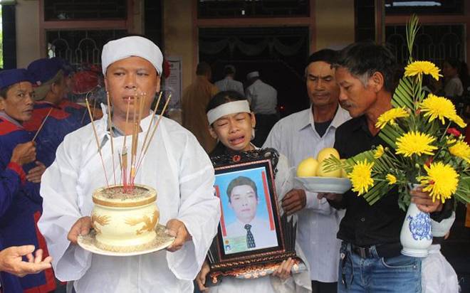Vợ và con anh Phóng cùng đi trên chuyến xe đang cấp cứu trong bệnh viện, đi trước linh cữu tiễn đưa anh Phóng là vợ chồng người em trai