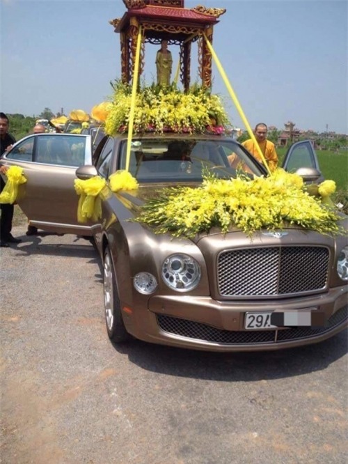 Theo ghi nhận, đoàn xe rước lễ tang của cụ X. thực hiện theo nghi lễ rước tượng Phật và đài sen, gồm 32 chiếc toàn nhãn hiệu xe sang Rolls-royce, Bentley, Audi, BMW... được trang trí hoa lan vàng, đài sen vàng, khăn vải vàng.
