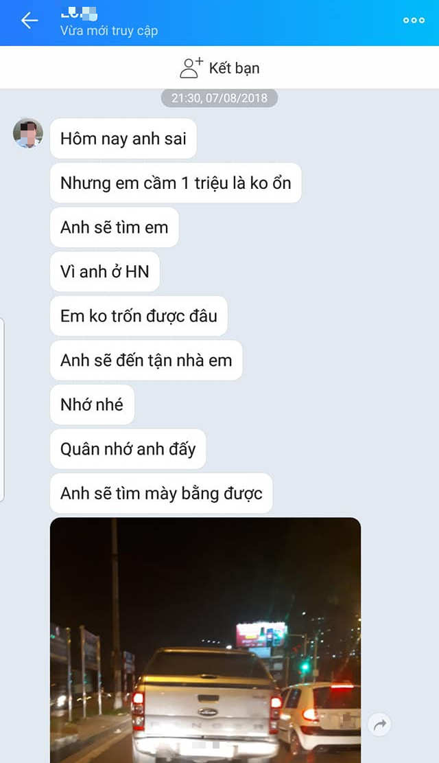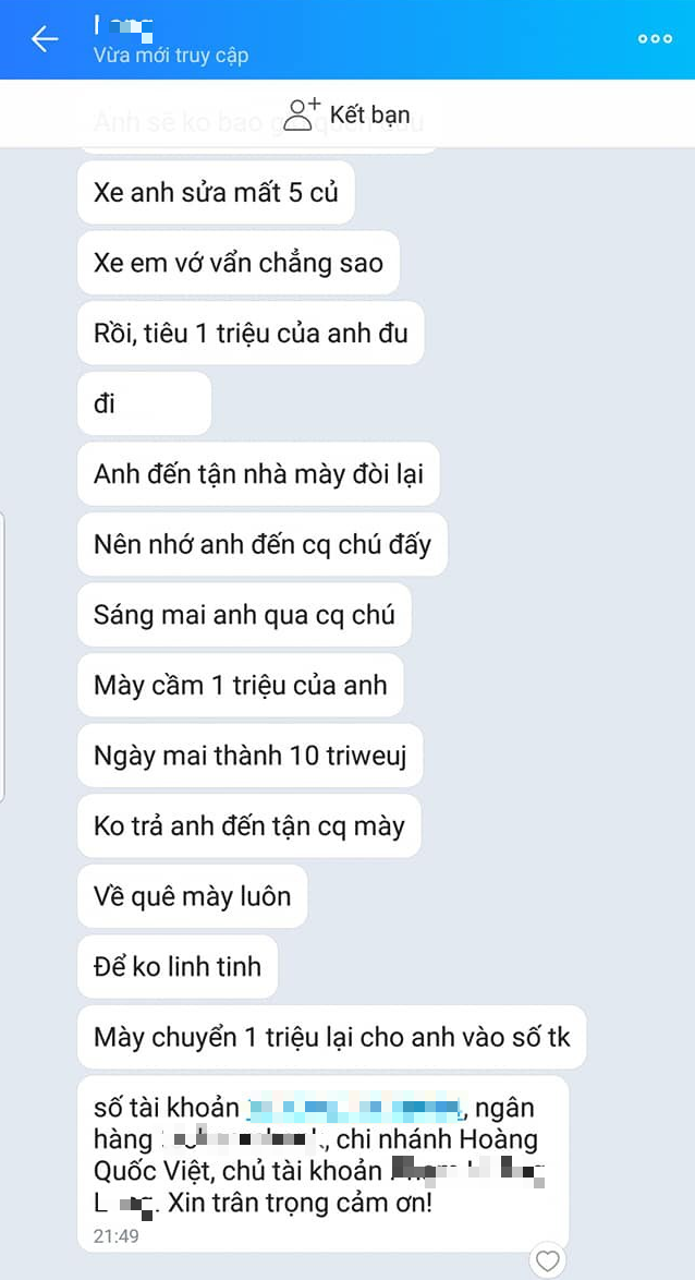 Nội dung những tin nhắn này mở đầu tuy nhận là mình sai, nhưng chủ yếu phía sau là đòi lại khoản tiền 1 triệu đồng anh ta đã bồi thường. Nếu không anh ta sẽ tìm đến tận nhà và cơ quan, thậm chí anh ta còn đòi tính lãi 1 triệu đồng không trả ngày mai sẽ là 10 triệu đồng.