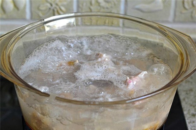 Cho giấm trắng vào nồi nước bắc lên bếp đun sôi sau đó cho thịt giò vào luộc trong 1 phút rồi vớt ra xối lại với nước lạnh.