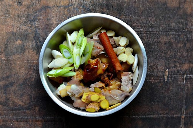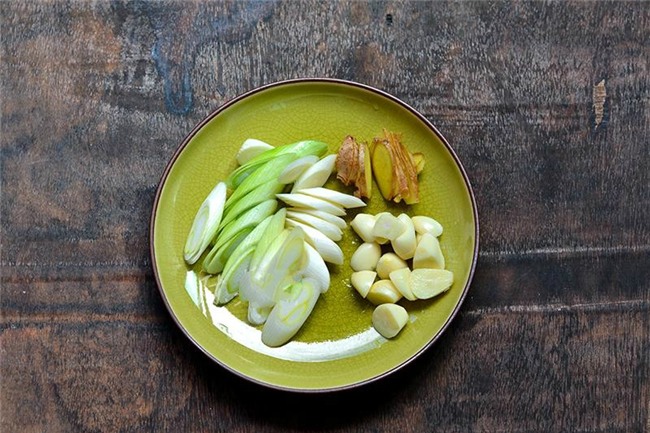 Chuẩn bị hành baro thái xéo, gừng thái mỏng và tỏi cắt làm 2 hoặc 3.