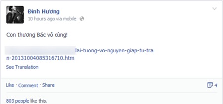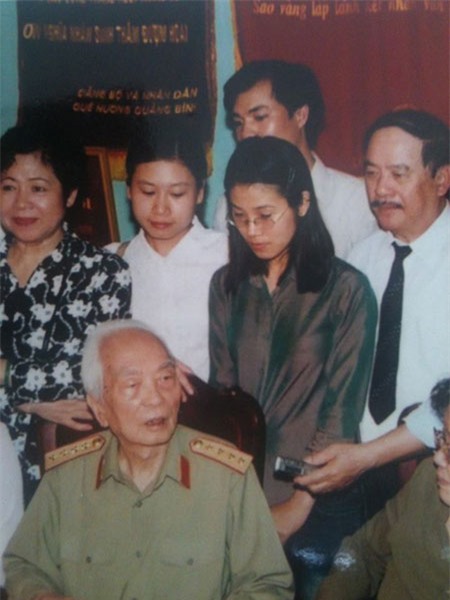 Nhà báo Phan Thúy Thảo (Báo Phụ nữ Việt Nam) đã chia sẻ trên trang cá nhân 1 bức ảnh kèm kỷ niệm đáng nhớ về lần đầu tiên chị được gặp Đại tướng: “Lần được gặp Đại tướng tại nhà cụ ở 30 Hoàng Diệu này hình như là năm 2003 hay 2004 gì đó. Đồng chí ba của Kem Zin đã không bỏ lỡ cơ hội "ăn theo" người yêu để tận mắt nhìn thấy vĩ nhân mà mình ngưỡng mộ. Nhớ là chú Khoa, chú Toán chụp cho khá nhiều ảnh, còn đăng cả bìa tạp chí Văn hiến, giờ chỉ tìm thấy mỗi tấm này.”