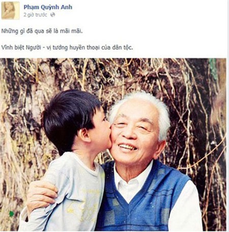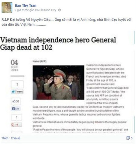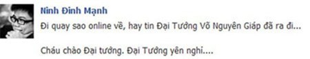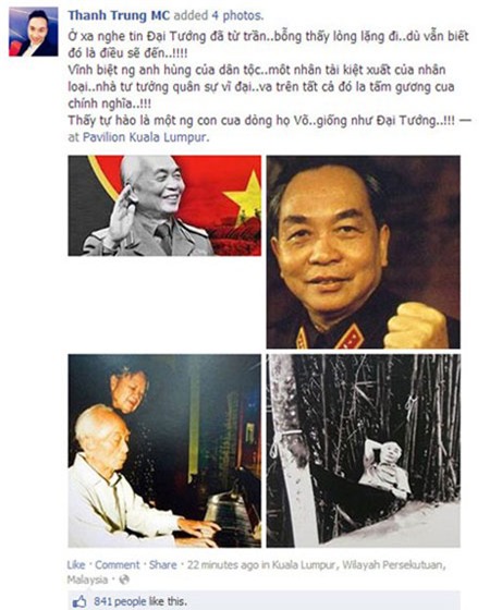 Trong khi đó, dù đang ở tận Kuala Lumpur (Malaysia) song khi nghe tin Đại tướng từ trần, MC Thành Trung không giấu nổi niềm xúc động: “Ở xa nghe tin Đại Tướng đã từ trần, bỗng thấy lòng lặng đi, dù vẫn biết đó là điều sẽ đến. Vĩnh biệt người anh hùng của dân tộc, môt nhân tài kiệt xuất của nhân loại, nhà tư tưởng quân sự vĩ đại, và trên tất cả đó là tấm gương của chính nghĩa! Thấy tự hào là một người con cua dòng họ Võ, giống như Đại Tướng”...