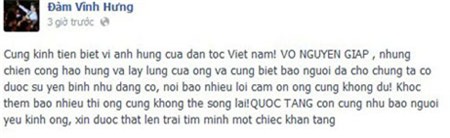 Đàm Vĩnh Hưng tiếp: “Ngay từ khi còn ngồi trên ghế nhà trường, những bài học về tấm gương anh hùng, cũng như sự đóng góp to lớn của các vị tướng lãnh tài ba của dân tộc thì 3 chữ Võ Nguyên Giáp luôn gây ấn tượng mạnh mẽ nhất đối với chúng tôi. Tên ông trở thành niềm tự hào của mỗi người dân Việt Nam khi có dịp nhắc đến. Sự ra đi của ông là một tổn thất rất lớn của dân tộc. Cũng như hàng triệu người Việt Nam khác, tôi xin trân trọng gửi lời chia buồn cùng gia đình ông. Cầu chúc linh hồn ông thanh thản”.