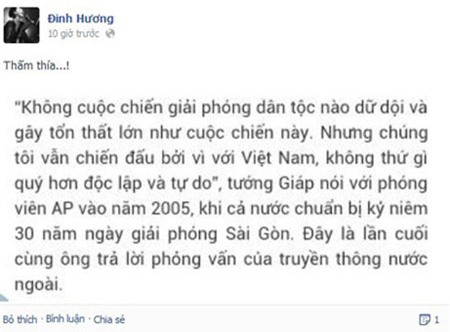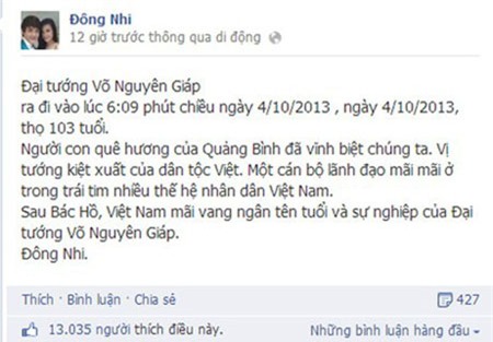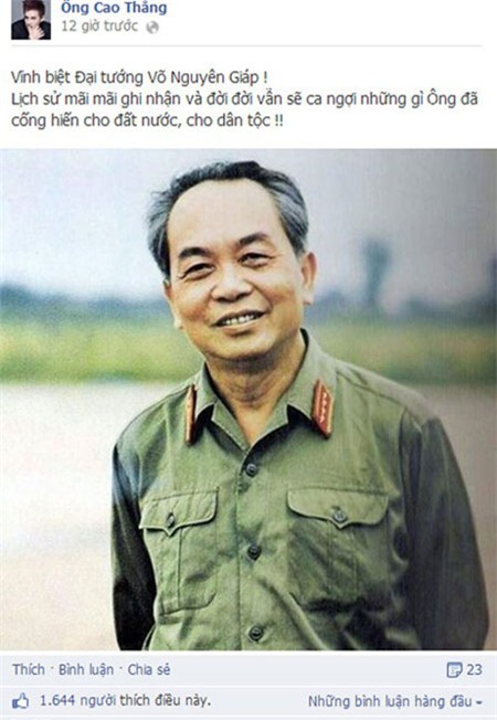 "Vĩnh biệt Đại tướng Võ Nguyên Giáp! Lịch sử mãi mãi ghi nhận và đời đời vẫn sẽ ca ngợi những gì Ông đã cống hiến cho đất nước, cho dân tộc!" Ca sĩ Ông Cao Thắng nghẹn ngào chia sẻ. |