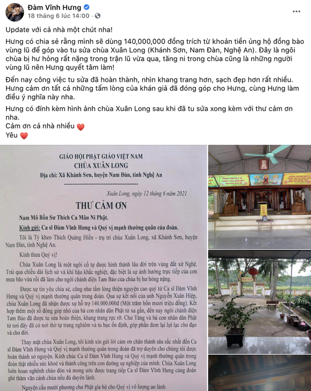 Ngay sau đó, nam ca sĩ đã lên tiếng phân trần: "Ngôi chùa này cũng đã bị hư hỏng rất nặng sau trận lũ lụt vừa rồi nên ngoài 15 ngôi nhà Hưng đang xây thì Hưng góp tiền tu sửa". Đồng thời, Đàm Vĩnh Hưng còn giải thích thêm, anh cho biết ngôi chùa này cũng thuộc miền Trung và việc sửa chùa cũng là 1 chuyện từ thiện. Tuy nhiên, netizen vẫn "khẩu chiến" nảy lửa sau khi Đàm Vĩnh Hưng lên tiếng.