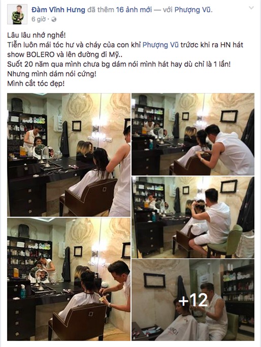 Cách đây ít giờ trên Facebook, Đàm Vĩnh Hưng vừa khoe hình ảnh cắt tóc cho cô học trò cưng Phượng Vũ. Từ mái tóc dài, qua tài hoa của “Ông hoàng nhạc Việt”, Phượng Vũ đã trở nên cá tính, trẻ trung hơn với kiểu tóc ngắn cực hợp mốt. Nam ca sĩ khẳng định bản thân chưa bao giờ dám nhận hát hay trong suốt 20 năm nhưng luôn tự hào vì bản thân cắt tóc đẹp.