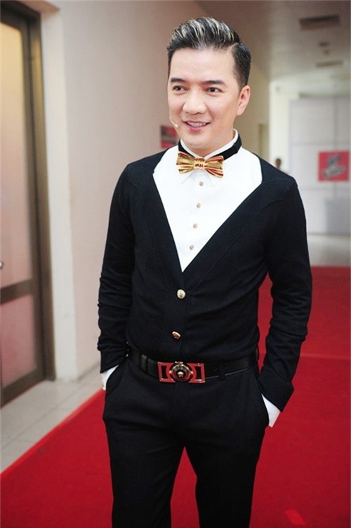 Dù chỉ là mặc áo sơ mi và áo len nhưng nam ca sĩ cũng nhấn nhá bằng chiếc nơ ánh kim sắc vàng.