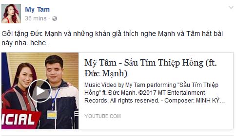 Ca sỹ Mỹ Tâm gửi tặng chàng trai khiếm thị Đức Mạnh và những người hâm mộ một món quà đặc biệt khiến hàng ngàn trái tim đã rưng rưng nước mắt vì bất ngờ và xúc động cũng như càng thêm cảm phục, yêu mến cô. Đó chính là ca khúc Sầu tím thiệp hồng được Mỹ Tâm và chàng trai khiếm thính Đức Mạnh cùng thực hiện tuyệt hay trong phòng thu.
