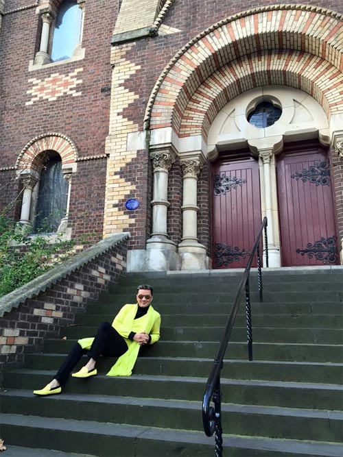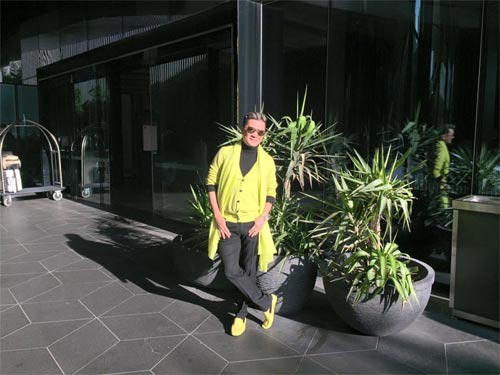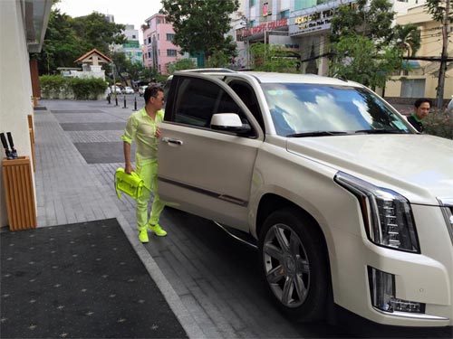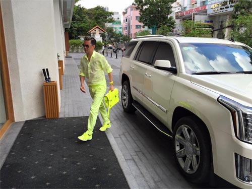 Đàm Vĩnh Hưng không ngần ngại diện cả bộ trang phục xanh đi làm việc. Điều thú vị là, Mr Đàm luôn biết cách phối hợp các phụ kiện ton sur ton với trang phục. Điều này khiến Đàm Vĩnh Hưng luôn nổi bật trước đám đông