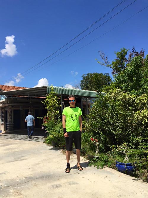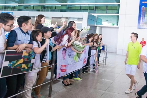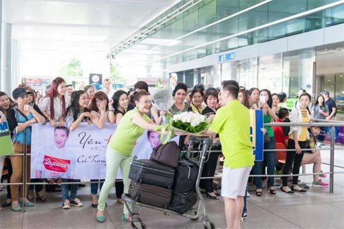 Mr Đàm diện trang phục màu xanh nổi bật gặp gỡ fan ở sân bay