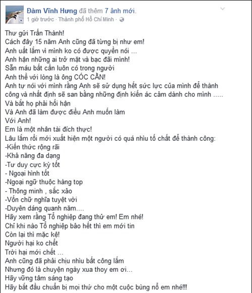 Những ngày qua, thông tin Trấn Thành bị cấm sóng trên Đài truyền hình Vĩnh Long gây xôn xao dư luận. Giữa lúc scandal đang dâng lên cao trào khiến hình ảnh của nam MC bị ảnh hưởng nghiêm trọng, nam ca sĩ Đàm Vĩnh Hưng bất ngờ viết bức tâm thư gửi người em thân thiết.