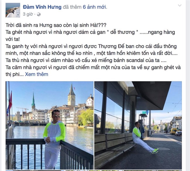 "Trời đã sinh ra Hưng sao lại còn sinh Hà? Ta ghét nhà ngươi vì nhà ngươi dám cả gan dễ thương ngang hàng với ta... Ta thù nhà ngươi vì dám nhào vô cấu xé miếng bánh scandal của ta. Ta căm nhà ngươi vì đã chiếm mất một nửa của ta về sự ganh ghét và thị phi...", nam ca sĩ viết.