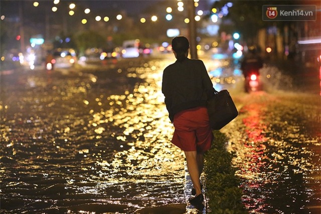 Đến 9h tối, một vài tuyến đường lớn đã rút nước, người dân hai bên đường vừa ăn vội ổ bánh mì, cái bánh bao cầm cự, lật đật chạy về nhà trước khi cơn mưa khác đổ xuống. Thế nhưng trên đường Nguyễn Hữu Cảnh, đoạn đường có nhiều tòa nhà văn phòng, nhà hàng và công trình xây dựng nhất thì... vẫn ngập.