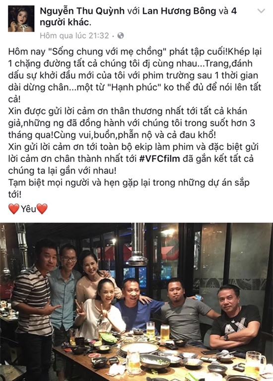 Trong khi đó, diễn viên Thu Quỳnh - người vào vai nàng dâu Trang đanh đá đã gửi lời cảm ơn chân thành của mình đến khán giả khi đã đồng hành cùng bộ phim trong suốt 3 tháng qua. "Khép lại 1 chặng đường tất cả chúng tôi đi cùng nhau. Trang đánh dấu sự khởi đầu mới của tôi với phim trường sau 1 thời gian dài dừng chân.