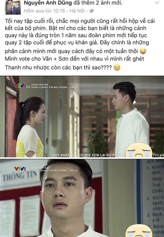 Trong khi đó, Anh Dũng lại khiến nhiều người bất ngờ khi ủng hộ cái kết để Vân và Sơn đến với nhau. Nam diễn viên chia sẻ rằng, dù vào vai Thanh nhưng anh rất ghét nhân vật này vì bản tính nhu nhược nên Vân cần đến với người đàn ông có thể đem đến cho cô hạnh phúc.