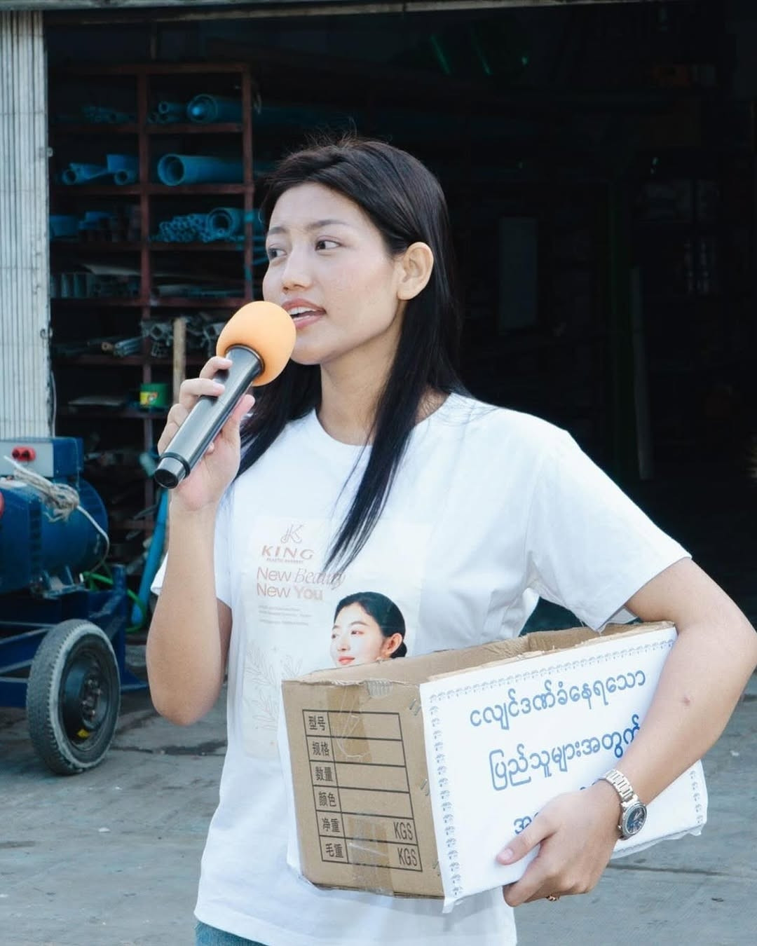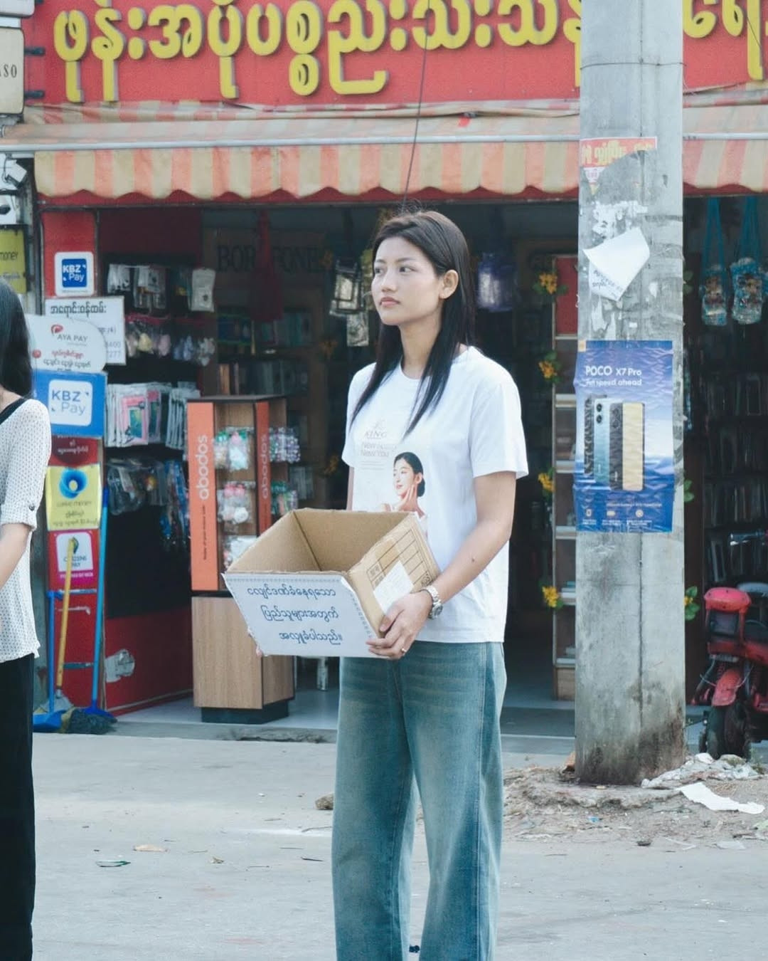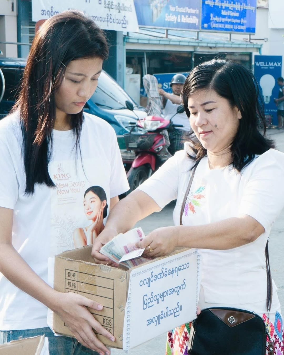 Không phô trương, Khisa Khin - đương kim Hoa hậu Thế giới Myanmar lặng lẽ xuống phố vận động quyên góp. Với cô, dù chỉ là một bữa cơm hay chai nước, mọi đóng góp đều mang ý nghĩa, góp phần giúp người dân vực dậy sau mất mát.