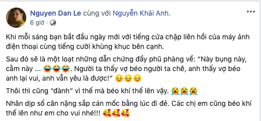 Có vẻ như câu chuyện bị chồng chụp ảnh "dìm hàng" việc tăng cân không phải là điều quá xa lạ đối với nhiều chị em phụ nữ. Nhưng chia sẻ phía sau của Đan Lê lại khiến nhiều người phải ghen tị bởi đạo diễn Khải Anh lại vô cùng tâm lý.