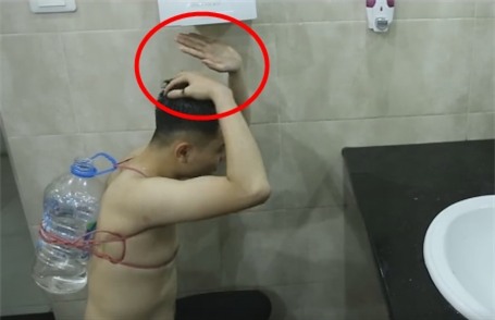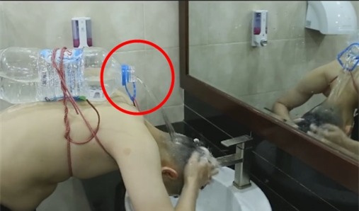 Một bình nước nhỏ, thêm sợi dây sẵn có trong nhà vậy là đã có ngay dịch vụ gội đầu cực kỳ tiện lợi. Chỉ cần cúi đầu xuống, nước tự động chảy ra và vấn đề mất nước đã được giải quyết.