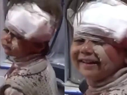 Trong video được hãng thông tấn nhà nước Syria (SANA) đăng tải, ban đầu cô bé mặc bộ quần áo dính máu, phủ đầy bụi đất, ngồi bần thần trên xe cứu thương.