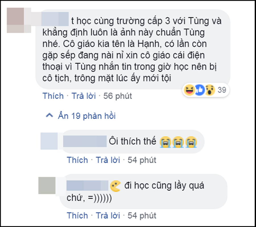 "Tớ học cùng trường cấp 3 với Tùng và khẳng định luôn là ảnh này chuẩn Tùng nhé. Cô giáo kia tên là Hạnh. Có lần còn gặp Tùng đang nài nỉ xin cô giáo cái điện thoại vì nhắn tin trong giờ học nên bị cô tịch thu. Trông mặt lúc ấy mới tội", một trong những bình luận gây chú ý nhất.