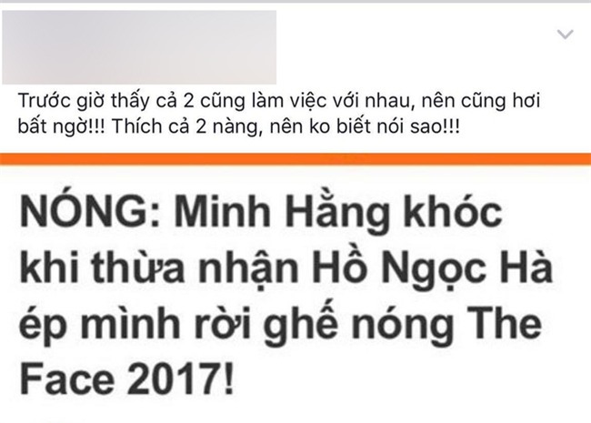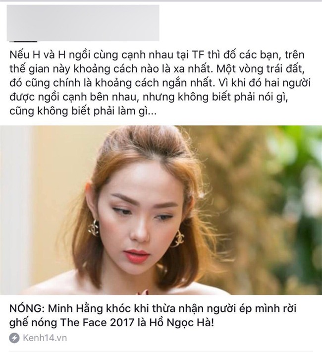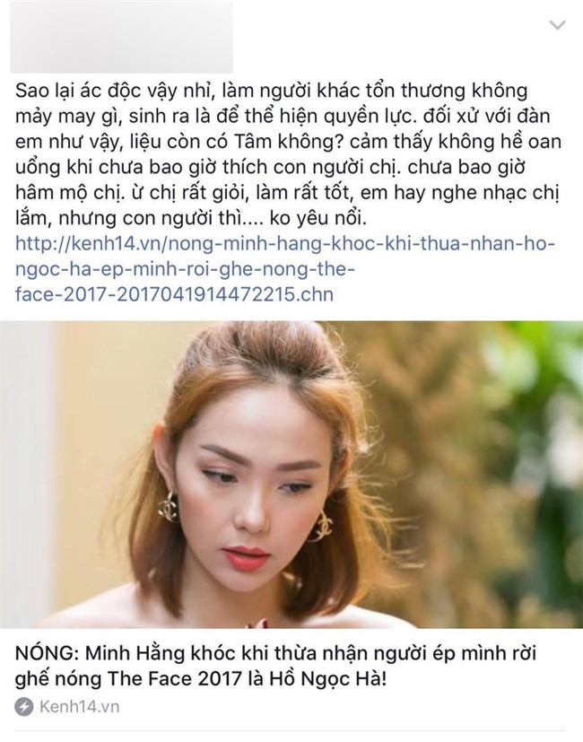 Trong livestream chia sẻ với độc giả mới đây, Minh Hằng t đã thừa nhận Hồ Ngọc Hà chính là người dùng sức ảnh hưởng để chèn ép cô rời khỏi ghế nóng The Face.