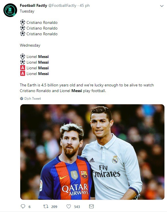"Trái Đất đã 4,5 tỉ năm tuổi. Thế mới thấy chúng ta may mắn như nào khi được xem Messi và Ronaldo chơi bóng".