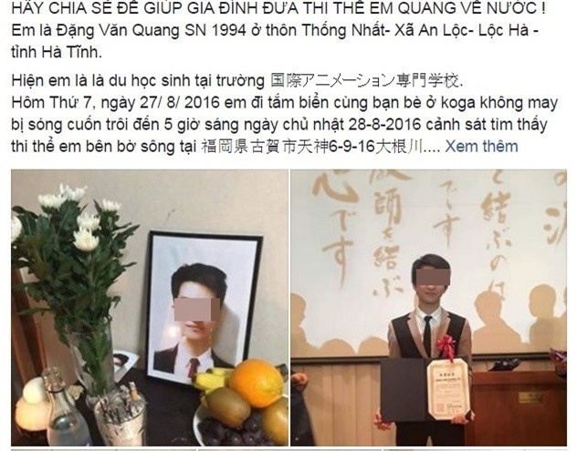 “Hãy chia sẻ để giúp gia đình đưa thi thể Quang về nước. Quang là du học sinh học tiếng Nhật tại Học viện ngoại ngữ AIWA. Ngày 27/8, em đi tắm biển cùng bạn bè ở Koga không may bị sóng cuốn trôi. Đến 5h sáng 28/8, cảnh sát tìm thấy thi thể em bên bờ sông.