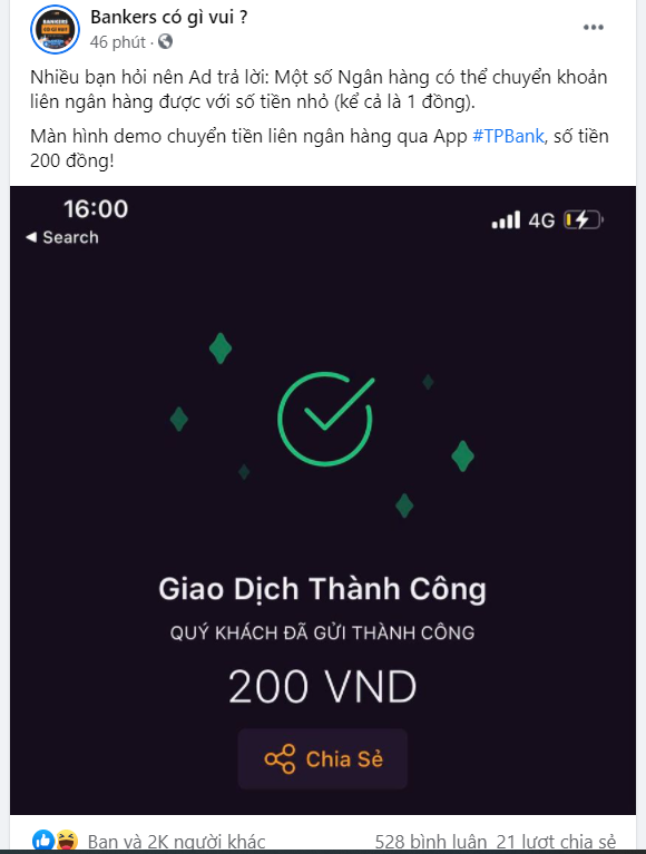 Trả lời thắc mắc trên, admin Banker có gì vui? - một page chia sẻ kiến thức và trò chuyện về ngành ngân hàng đã giải đáp: "Một số ngân hàng có thể chuyển khoản liên ngân hàng được với số tiền nhỏ (kể cả là 1 đồng)". Admin chứng minh luôn bằng cách chuyển khoản thử liên ngân hàng qua App #TPBank, số tiền 200 đồng!