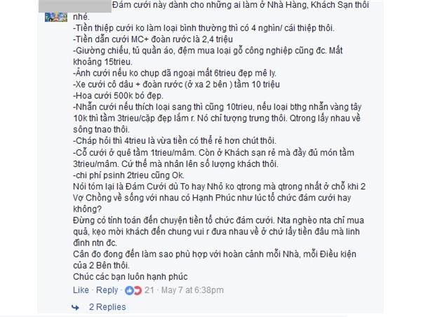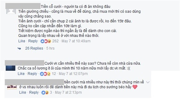 Trong khi đó, nhiều chị em lại lên tiếng đồng tình với chi phí cưới hỏi này. Một bạn phản hồi: "Thế các ông mất có hơn 100 triệu để được thêm cô vợ về chăm cho các ông cả đời lại còn phải liều mình sinh con cho các ông nữa". Bạn nữ khác cũng lên tiếng: "Lấy vợ rồi có người làm ô sin cả đời cho không lấy lương, có người đẻ con cho không lấy công. Lúc ốm đau nó hầu từ trên xuống dưới còn lãi gấp trăm gấp ngàn lần cái tiền ông bỏ ra".