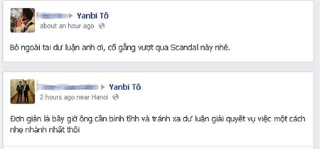 Tuy nhiên, ở một góc nhìn khác, các fan cuồng và bạn bè của Yanbi vẫn cố gắng bênh vực anh. Không ít người khuyên nam ca sĩ nên nhanh chóng đóng cửa trang cá nhân để tránh những điều tiếng không hay. Tuy nhiên, không chỉ từ chối những lời khuyên này, Yanbi thậm chí còn chia sẻ rất nhiều status khác nhau suốt từ khi vụ việc gây xôn xao đến nay. Thậm chí, Yanbi còn đăng status tuyển người yêu cho mùa đông này: "Có bạn nữ nào cần dịch vụ sưởi ấm trong mùa đông lạnh giá này pm mình nhé". Điều này khiến nhiều người cho rằng anh chẳng quan tâm tới hành động của mình cũng như những nhận xét, đánh giá của cư dân mạng.