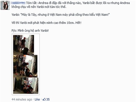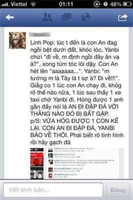 Một dân mạng đã viết: "Lúc tớ đến là chị An đang ngồi bệt dưới đất, khóc lóc, Yanbi chửi "Đi về, mày định ngồi đây ăn vạ à" xong túm tóc lôi dậy. Chị An hét lên "aaaaaaa"... Yanbi: "Mày tưởng mày là Tây là tao sợ à? Đi về", giằng co một lúc chị An chạy đi, không rõ như thế nào nữa. Một lúc sau thấy 1 xe taxi chở Yanbi đi. Hóng được 1 anh gần đấy nói là An đi đập đá với thằng nào đó ở nhà nghỉ bị bắt gặp...". Ngay sau đó, hàng loạt người khác bày tỏ sự tán đồng với thông tin này.