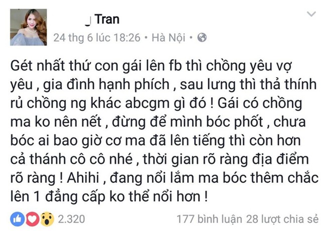 Bà xã Việt Anh – chị Hương Trần – trong ngày 24/6 cũng có 1 status khá gay gắt nói về việc chồng mình bị 1 cô gái đã có chồng mà vẫn “thả thính” rủ Việt Anh ra ngoài “làm gì đó”.