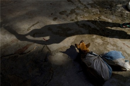 Bóng một người sử dụng gậy để đánh một con chó trước khi mổ tại làng Bambanglipuro, gần thành phố Yogyakarta, Indonesia.