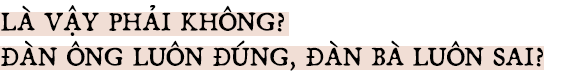 Chồng bồ bịch lăng nhăng, là do tôi không chăm sóc, chiều chuộng anh ấy. Chồng xa lánh gia đình cả mấy năm trời đằng đẵng, là do tôi không khéo léo, không biết cách giữ chân chồng. Là vậy phải không? Đàn ông luôn đúng, đàn bà luôn sai? Cũng giống như đạo lí mà ông Vũ từng nói ấy, là gia đình thì phải có trên có dưới rõ ràng. Đàn ông luôn ở trên, đàn bà là phải ở dưới! Thật cay đắng biết bao.