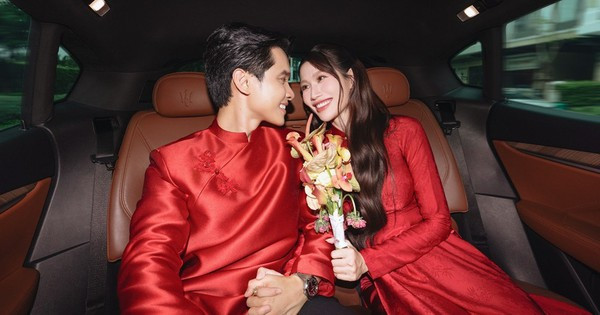 Trong lễ vu quy, Quỳnh Châu tỏa sáng trong tà áo dài đỏ thắm, sắc màu biểu trưng cho hỷ sự và may mắn. Thiết kế ôm dáng cổ điển, thêu hoa văn tinh tế giúp tôn lên vóc dáng mảnh mai cùng thần thái thanh tao của nàng dâu mới. Mái tóc dài buông nhẹ, làn da trắng mịn và nụ cười tươi rạng rỡ khiến cô trở thành tâm điểm giữa không gian ngập sắc đỏ hồng của ngày trọng đại.