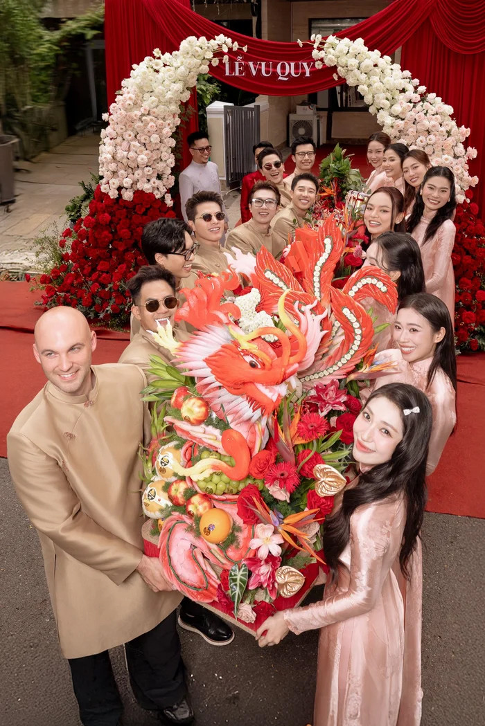 Các phù dâu đồng loạt diện áo dài tông hồng tươi tắn, làm nổi bật không khí trang trọng mà vẫn tràn đầy sự tươi trẻ. Trong khi đó, dàn phù rể của chú rể Phát Nguyễn cũng không kém cạnh với sự xuất hiện của ca sĩ Mai Tiến Dũng, Quốc Thiên, stylist Hoàng Ku, nhà thiết kế Hứa Lê Đức Anh, MC Minh Xù và Max Trần. Khoảnh khắc hai hàng phù dâu - phù rể tiến vào làm lễ nhận tráp đã trở thành một trong những hình ảnh đáng nhớ nhất trong buổi sáng trọng đại.